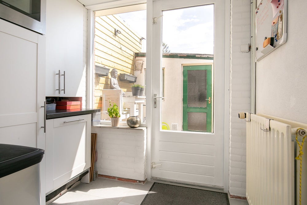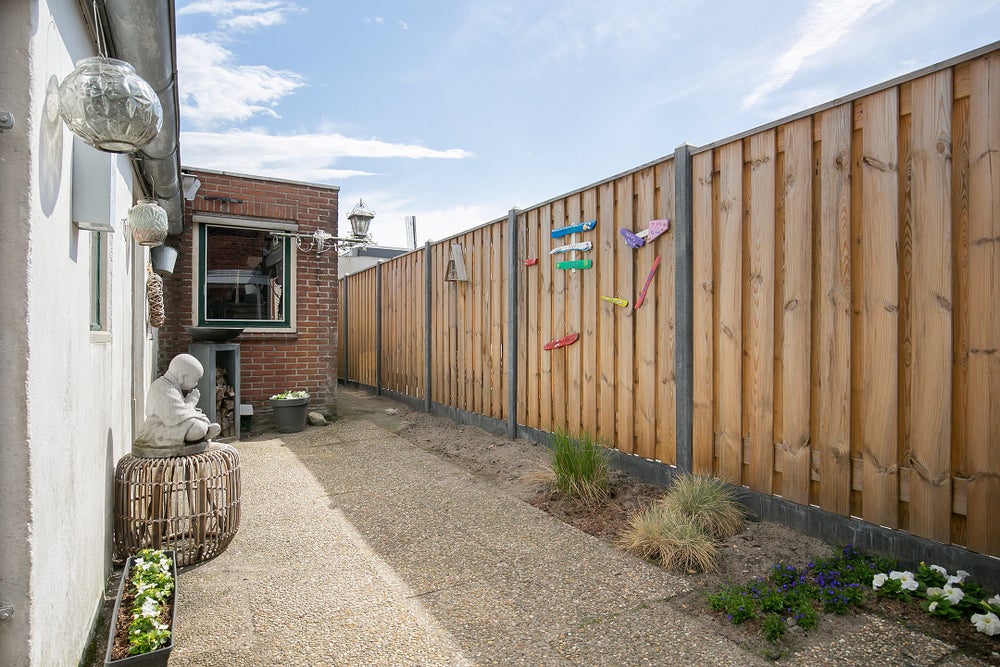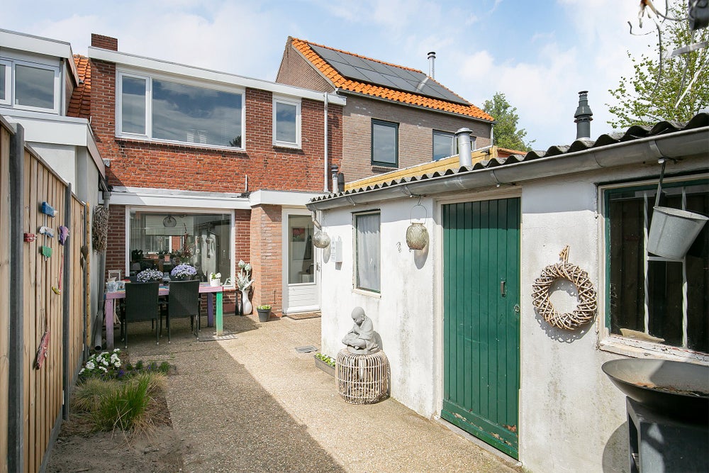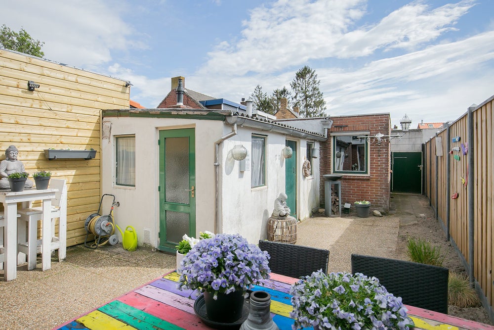 De op het zuiden georiënteerde tuin van 45m² biedt volop zon en een heerlijk terras om te ontspannen of gezellig te tuinieren. Daarnaast is er een handige achterom, wat het gebruiksgemak verhoogt.